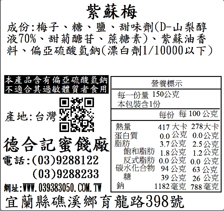 內容物名稱:梅子、糖、鹽、甜味劑(D-山梨醇液70%、甜菊醣苷、蔗糖素)、紫蘇油香料、偏亞硫酸氫鈉(漂白劑1/10000以下)